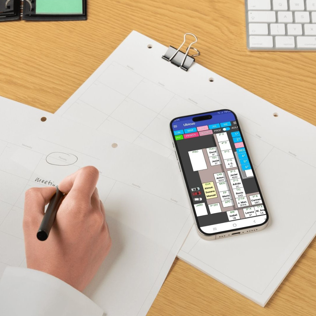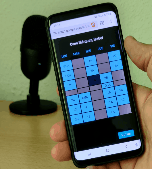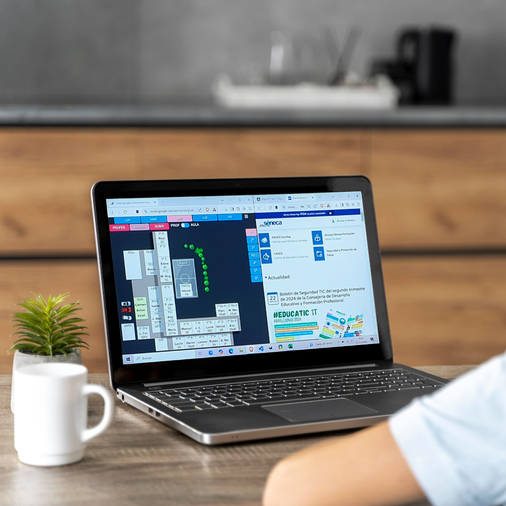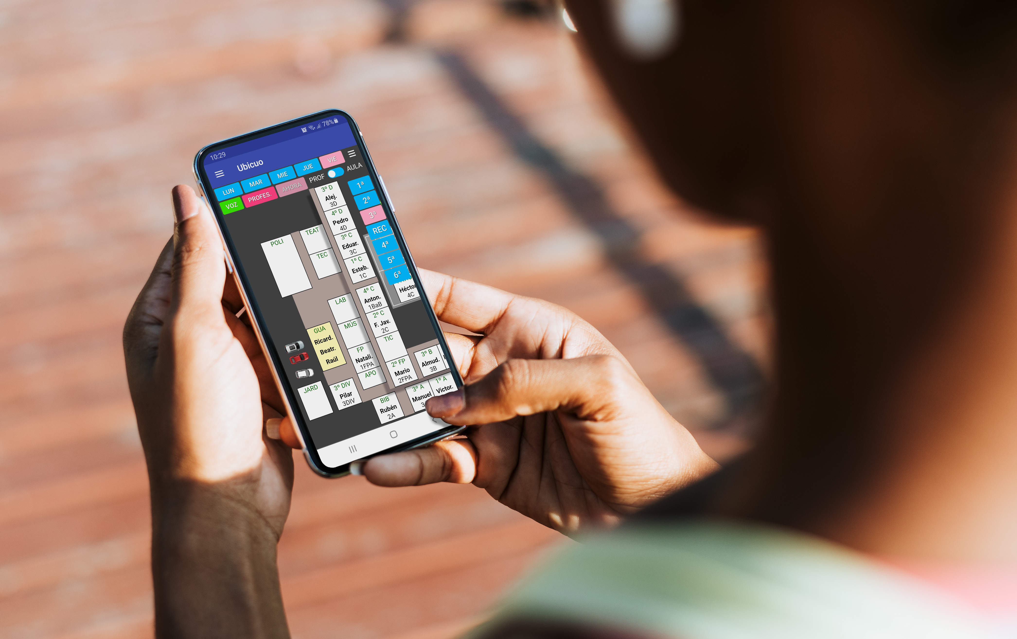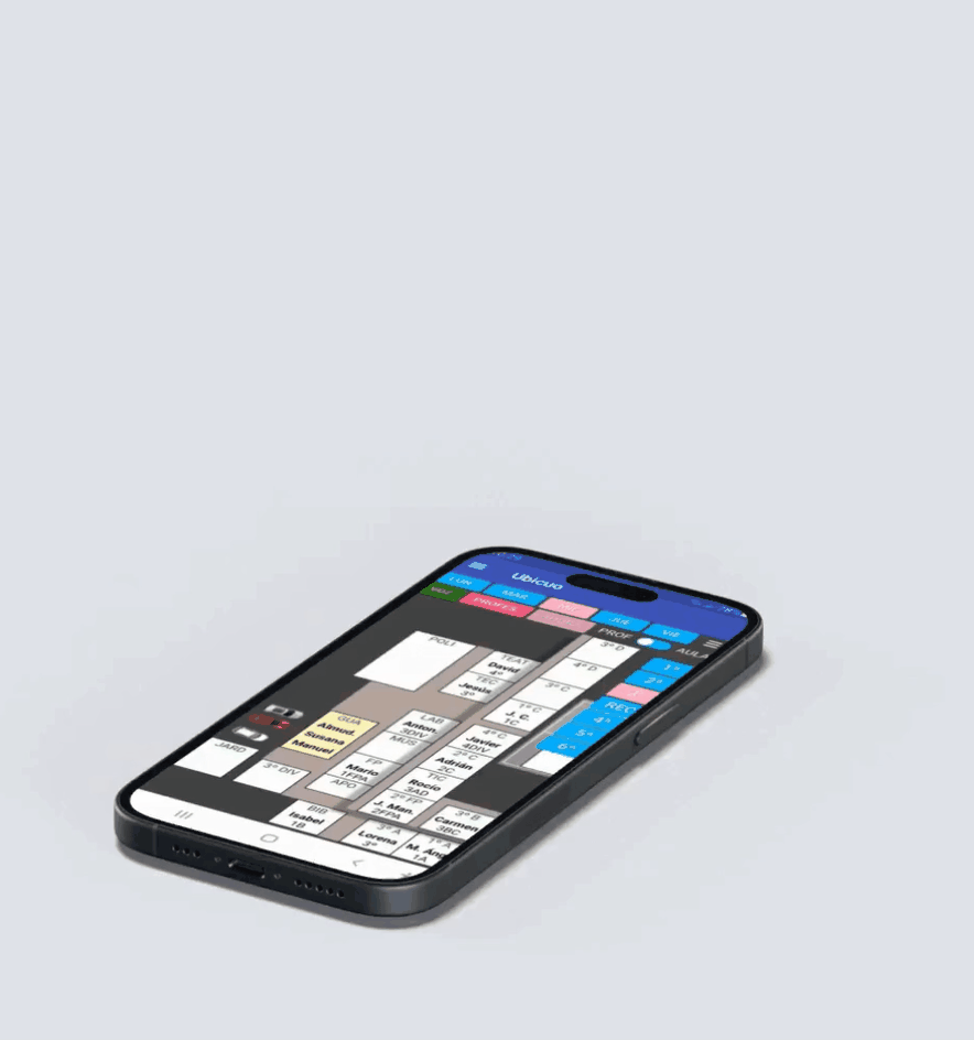 Visualiza el escenario en tiempo real de la ubicacion de los profesores en cada una de las aulas del centro. Desplázate por las barras de navegación de días y horas para mostrar el escenario en cualquier otro momento de la semana.